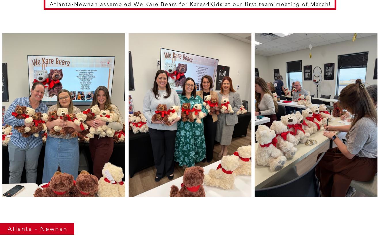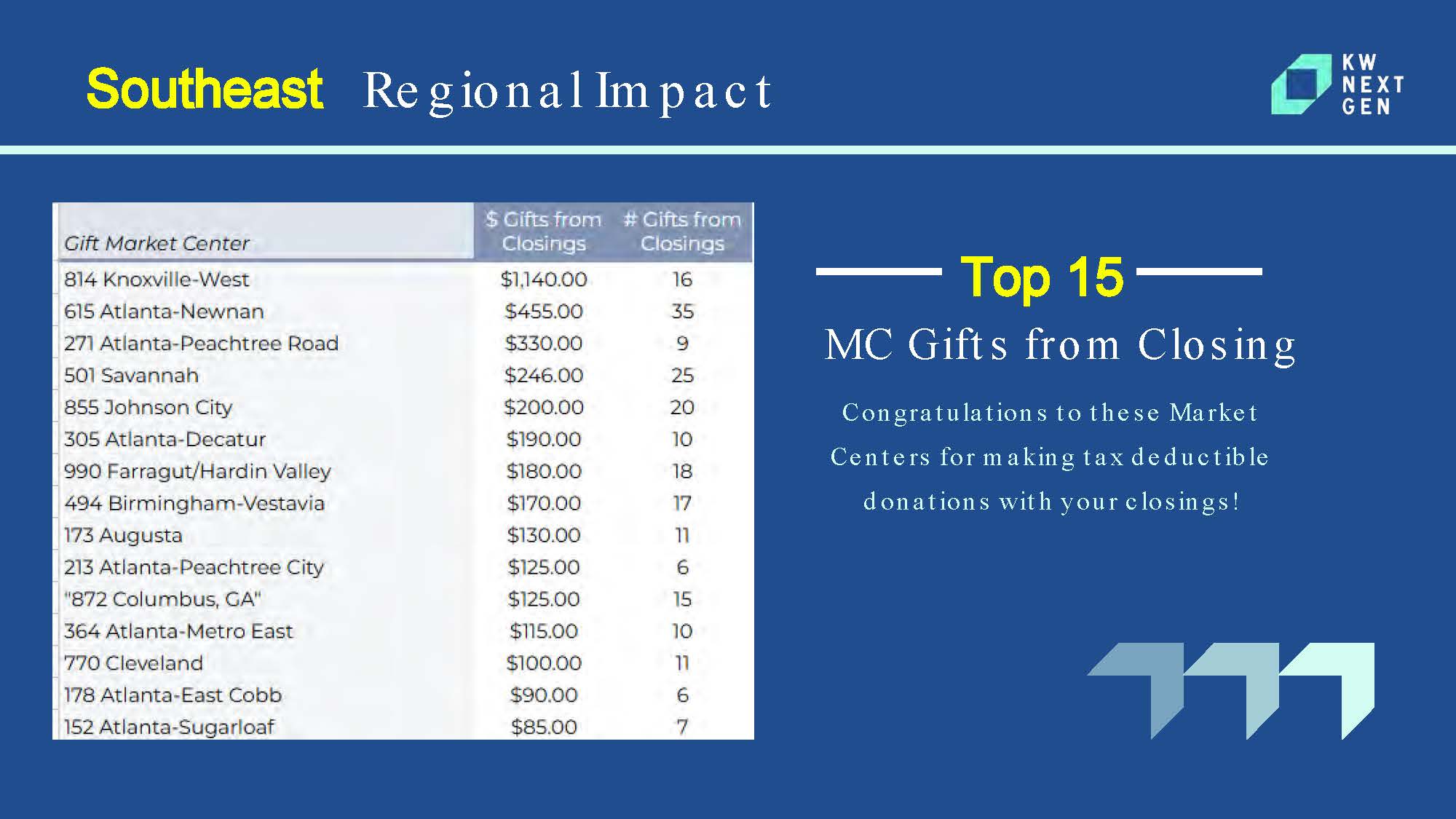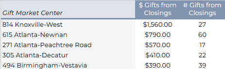 Several Market Centers are leading the way through Gifts from Closings, including Knoxville-West, Atlanta-Newnan, Atlanta-Peachtree Road, Atlanta-Decatur, Birmingham-Vestavia, Savannah, Augusta, and Johnson City.