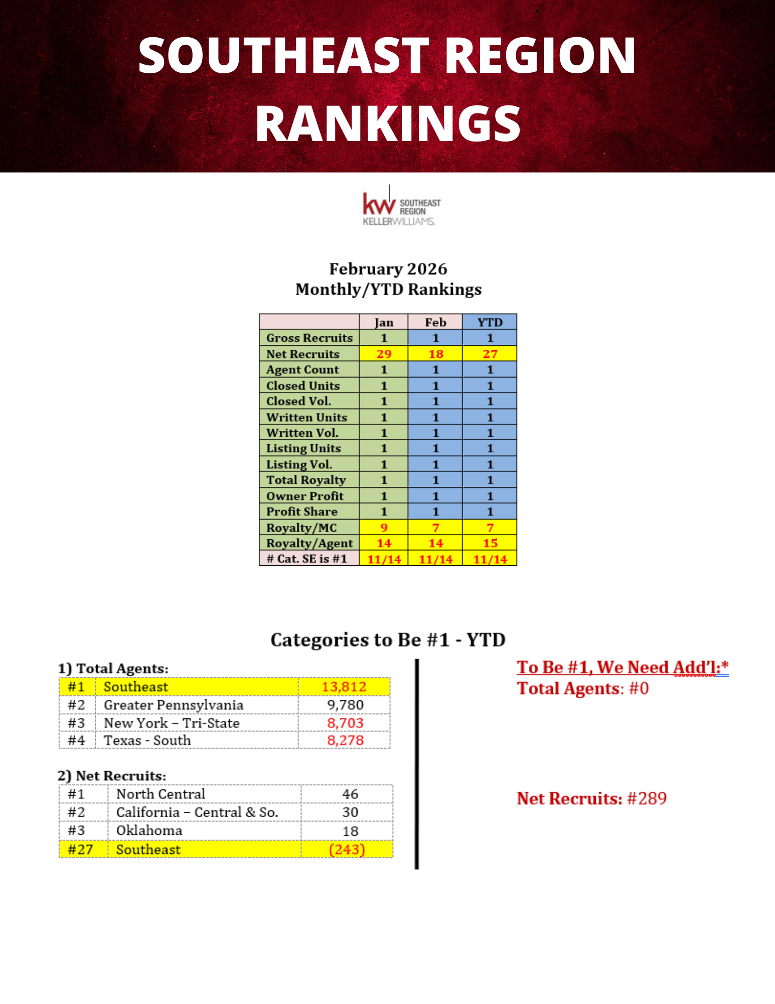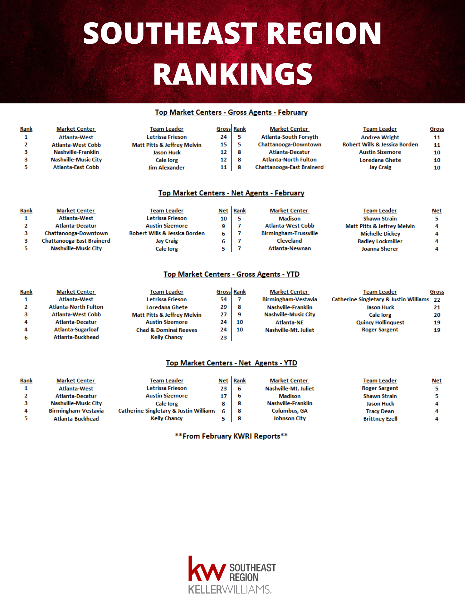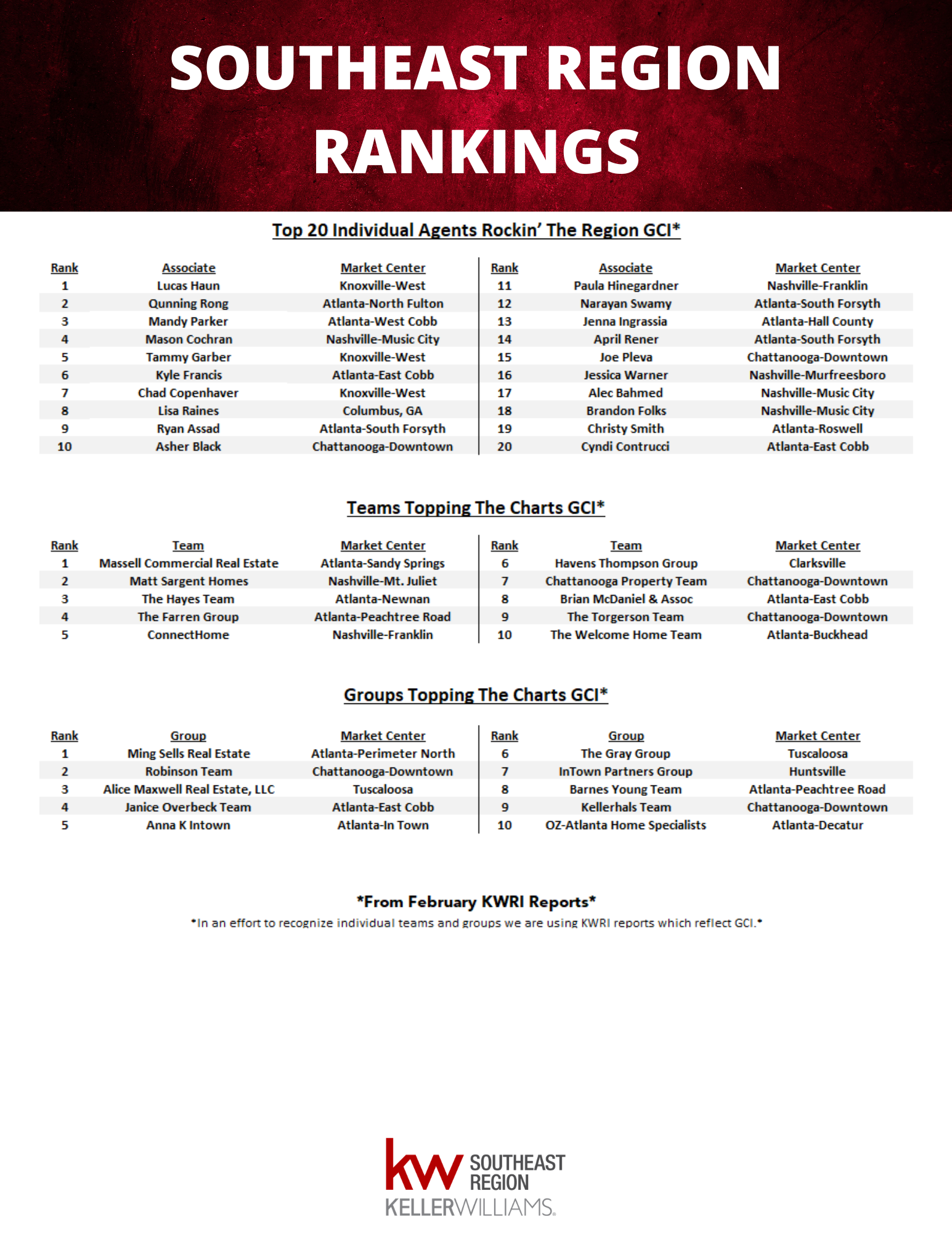 From February KWRI Reports: In an effort to recognize individual teams and groups, we are using KWRI reports which reflect GCI.